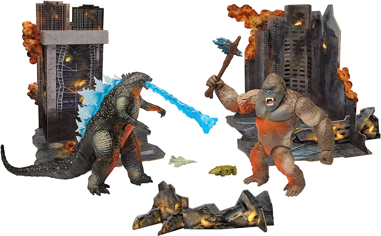 Monsterverse City Battle Godzilla and Kong 6-Inch Action Figure 2-Pack:Harness the awesome power of Godzilla’s thunderous roar and devastating tail-swipe as the king of the monsters battles Kong to settle an ancient rivalry! This 2-pack includes Godzilla and Kong 6-inch scale figures with battle damage. Multi piece, multi level city destruction diorama to reenact the big battle between Godzilla and Kong in the 2021 blockbuster movie. Also included are these accessories for full on display and play: Godzilla’s Heat Ray, Kong’s Battle Axe, HEAV Vehcile and Jet Fighter accessories! Legends collide as Godzilla and Kong, the two most powerful forces of nature, clash in a spectacular battle for the ages! The monster war rages on the surface and deep within our world as the spectacular secret realm of the titans known as the Hollow Earth is revealed! Godzilla features 5 points of articulation and Kong includes 13 points of articulation.